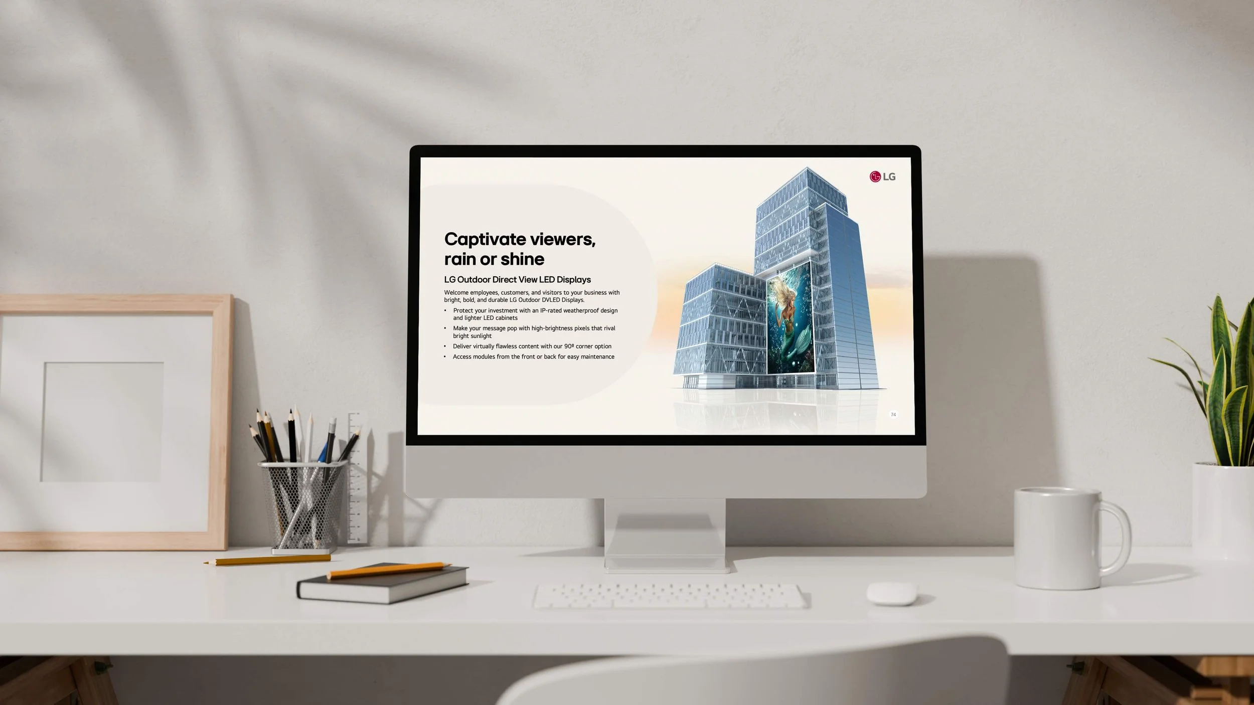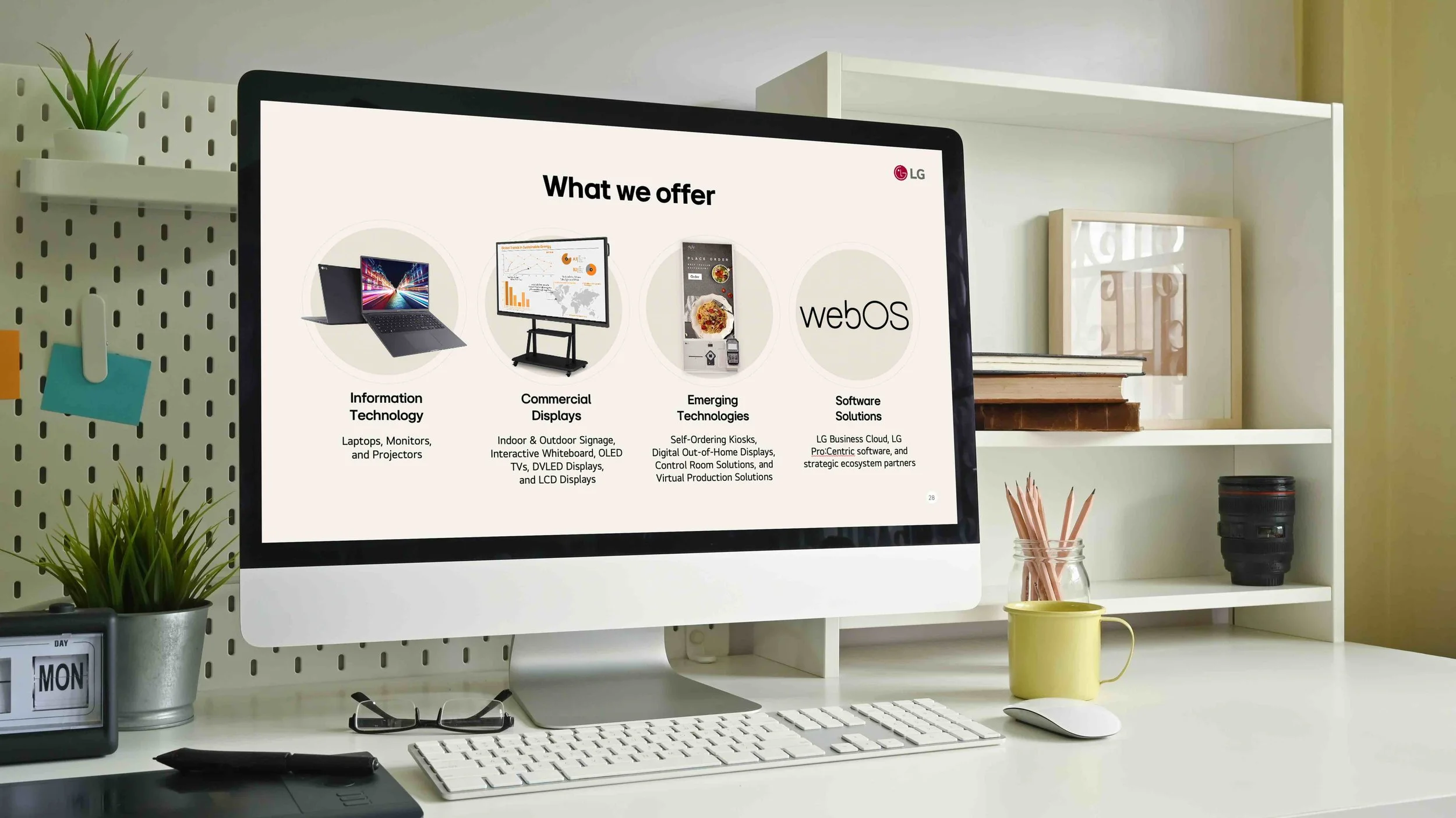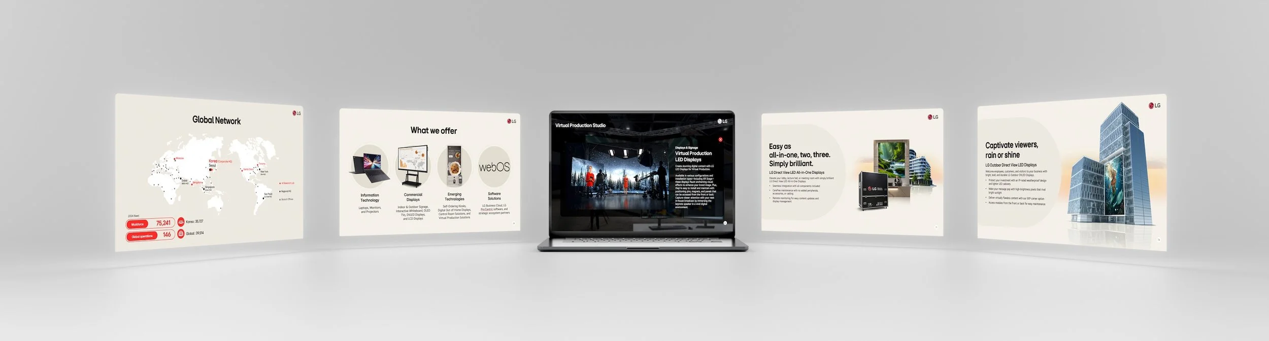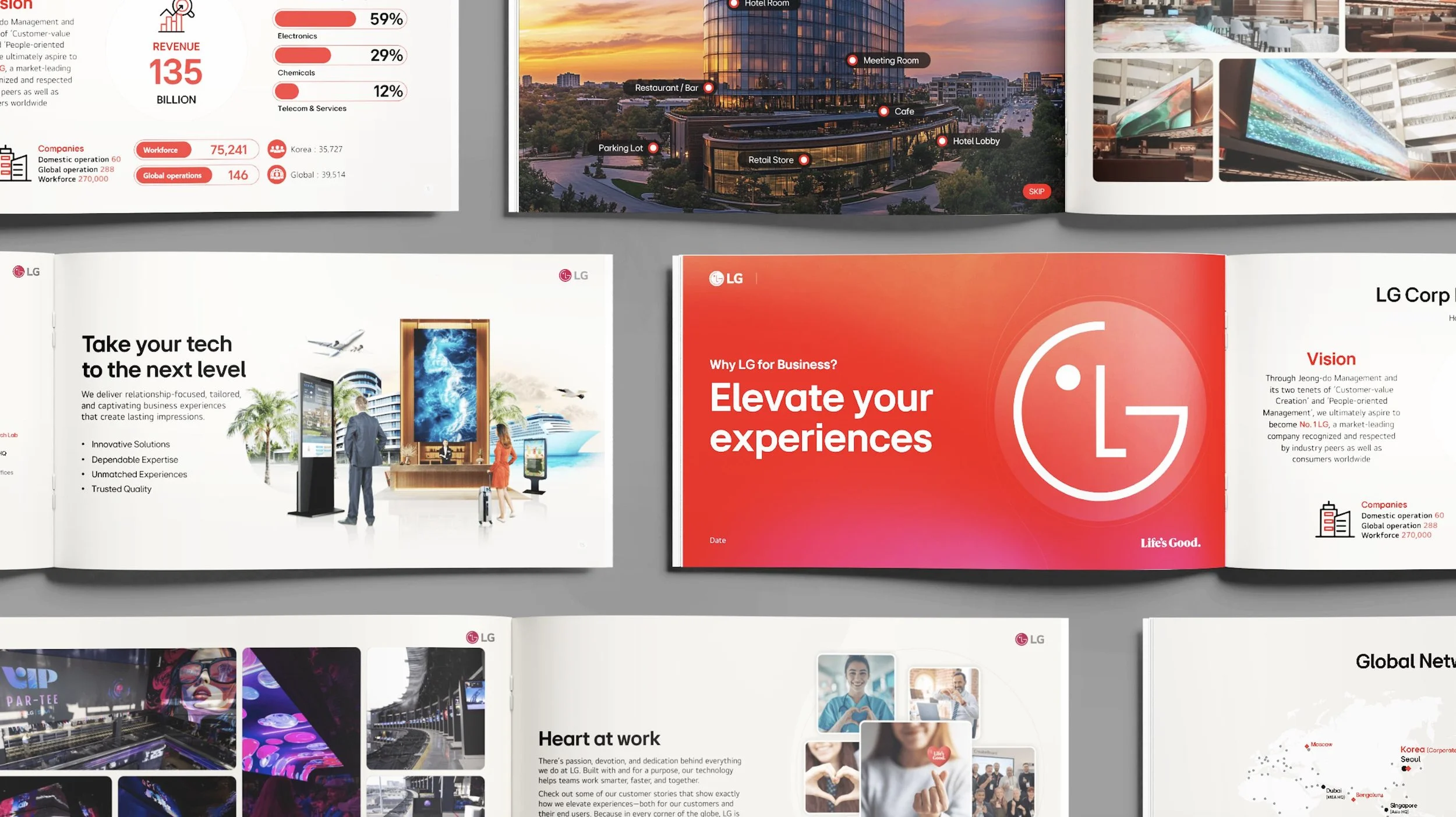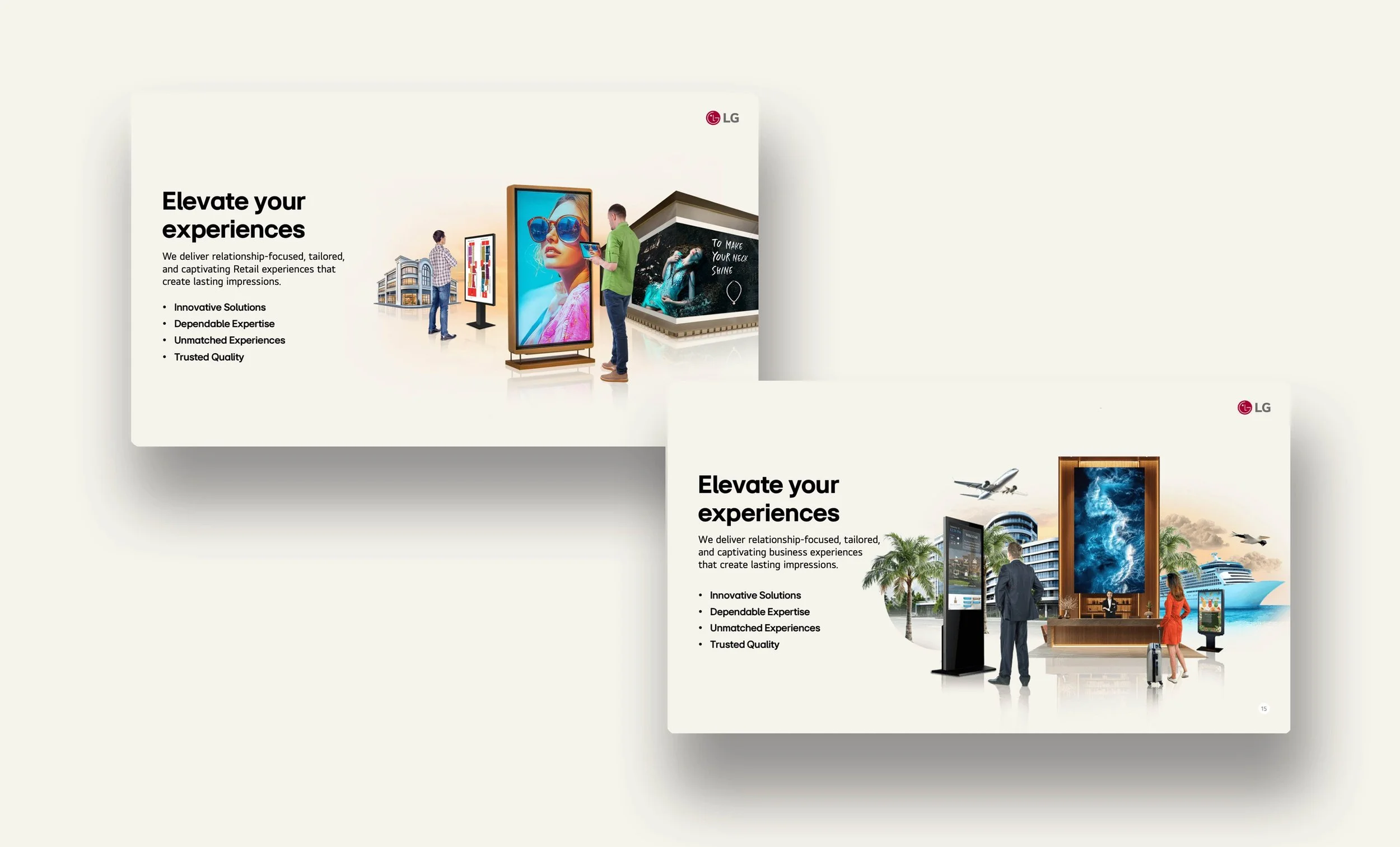 LG needed customized sales enablement decks for Corporate, Retail, Hospitality, Tech, Pharma, Energy, and Financial. Each deck featured a section on use cases for each of their specific products. Hospitality featured uses cases in hotels and event spaces, Corporate featured use cases in meeting rooms and innovative desktop set ups, and Retail featured in-store and point of purchase products. The results were highly specialized sales tools that helped LG sales people more easily sell and present their products by vertical.