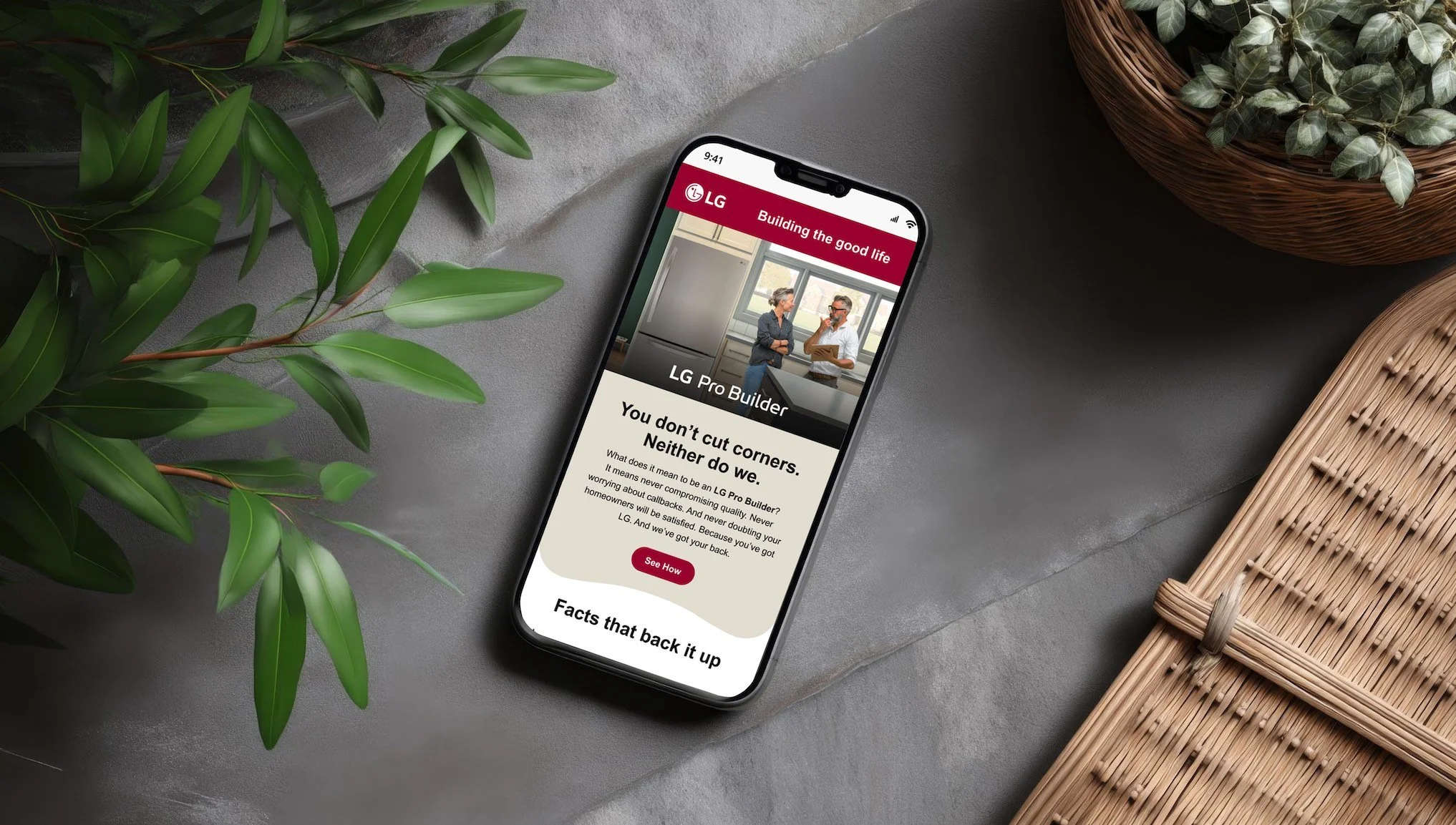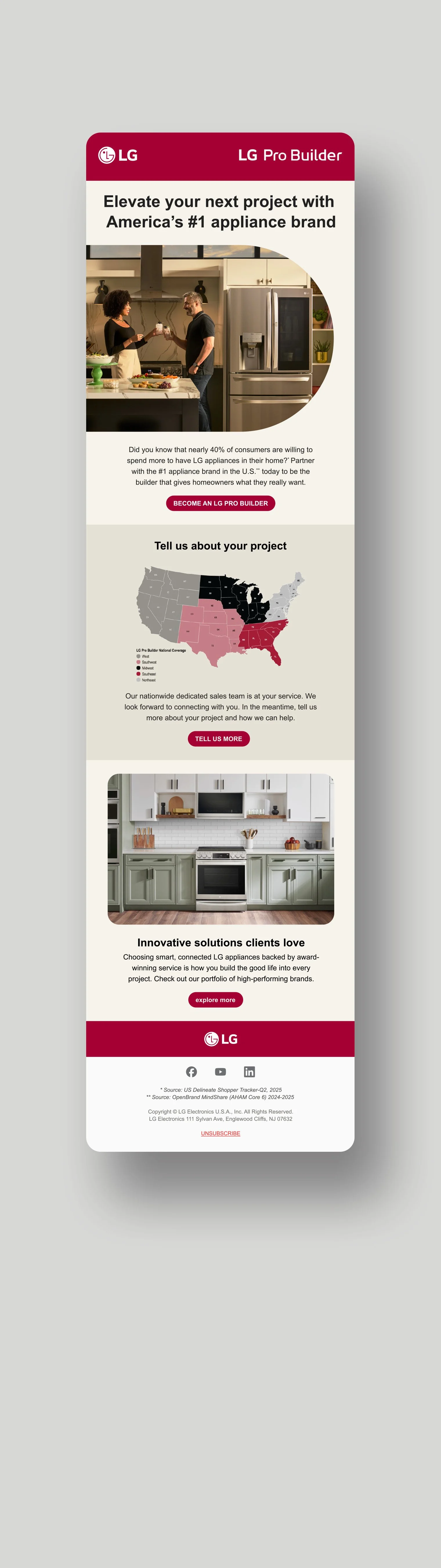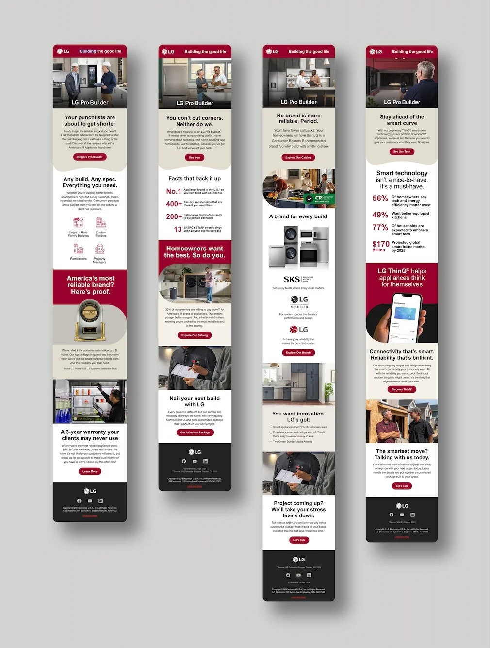 LG Pro Builder sells the LG portfolio of appliances to a variety of builder types. I partnered with our strategy and account teams to audit their email streams then refresh them creatively and strategically. In the past, their emails were too copy heavy, not mobile-friendly, did not follow modern email best practices, had opportunities for a better visual flow, and the look and feel did not align to the new LG brand. Take a look at few parts and pieces from the overall audit first.