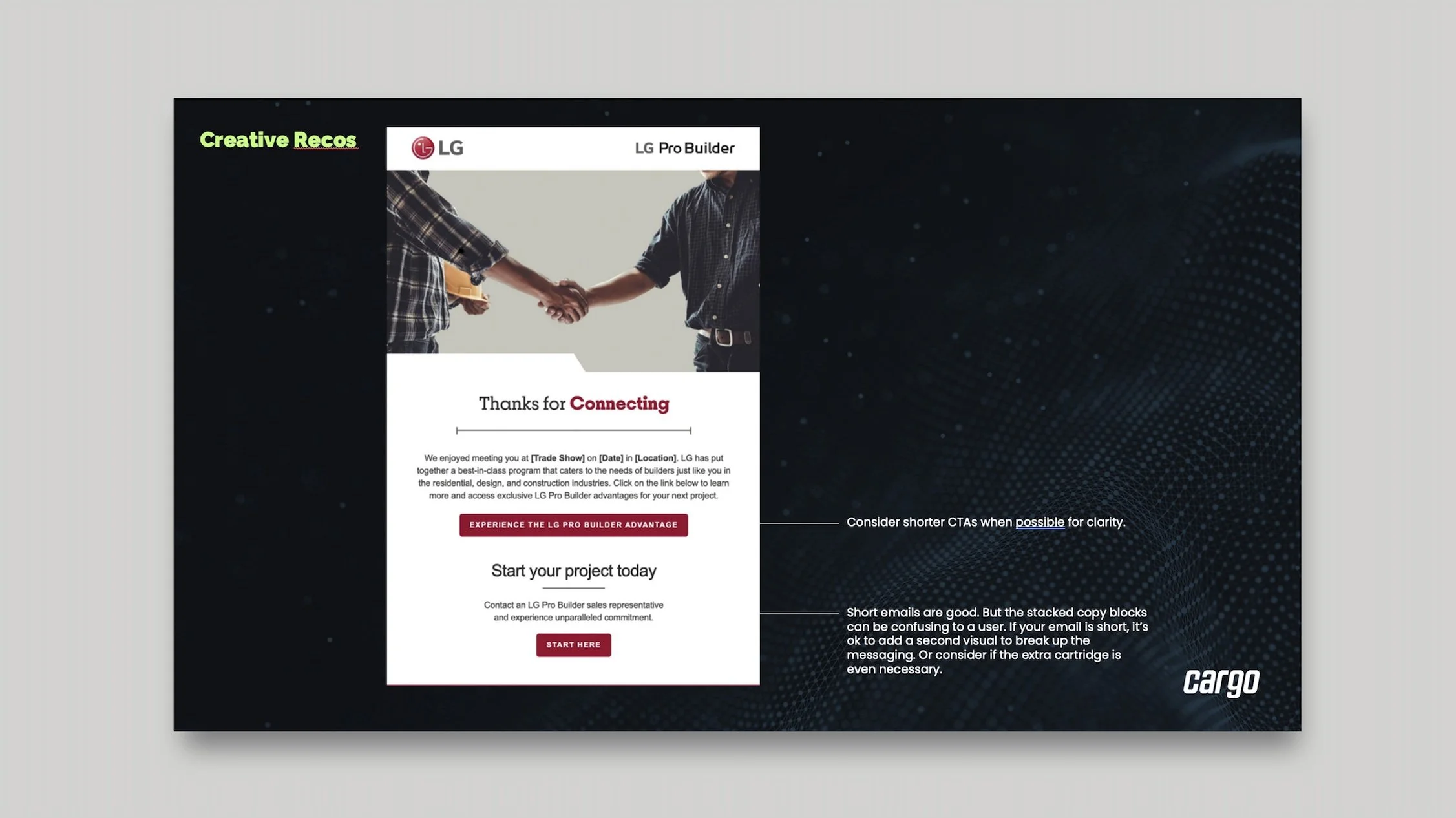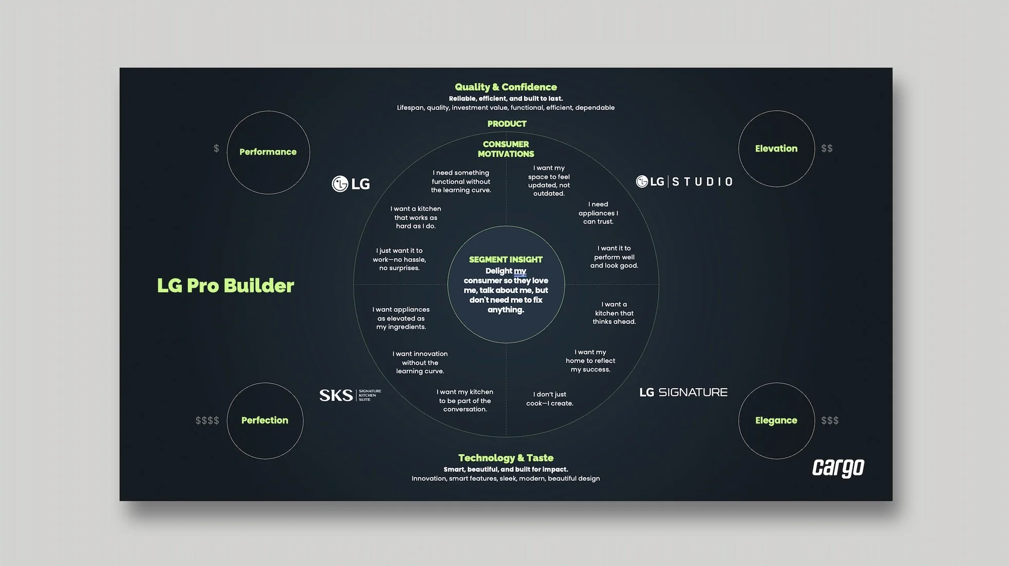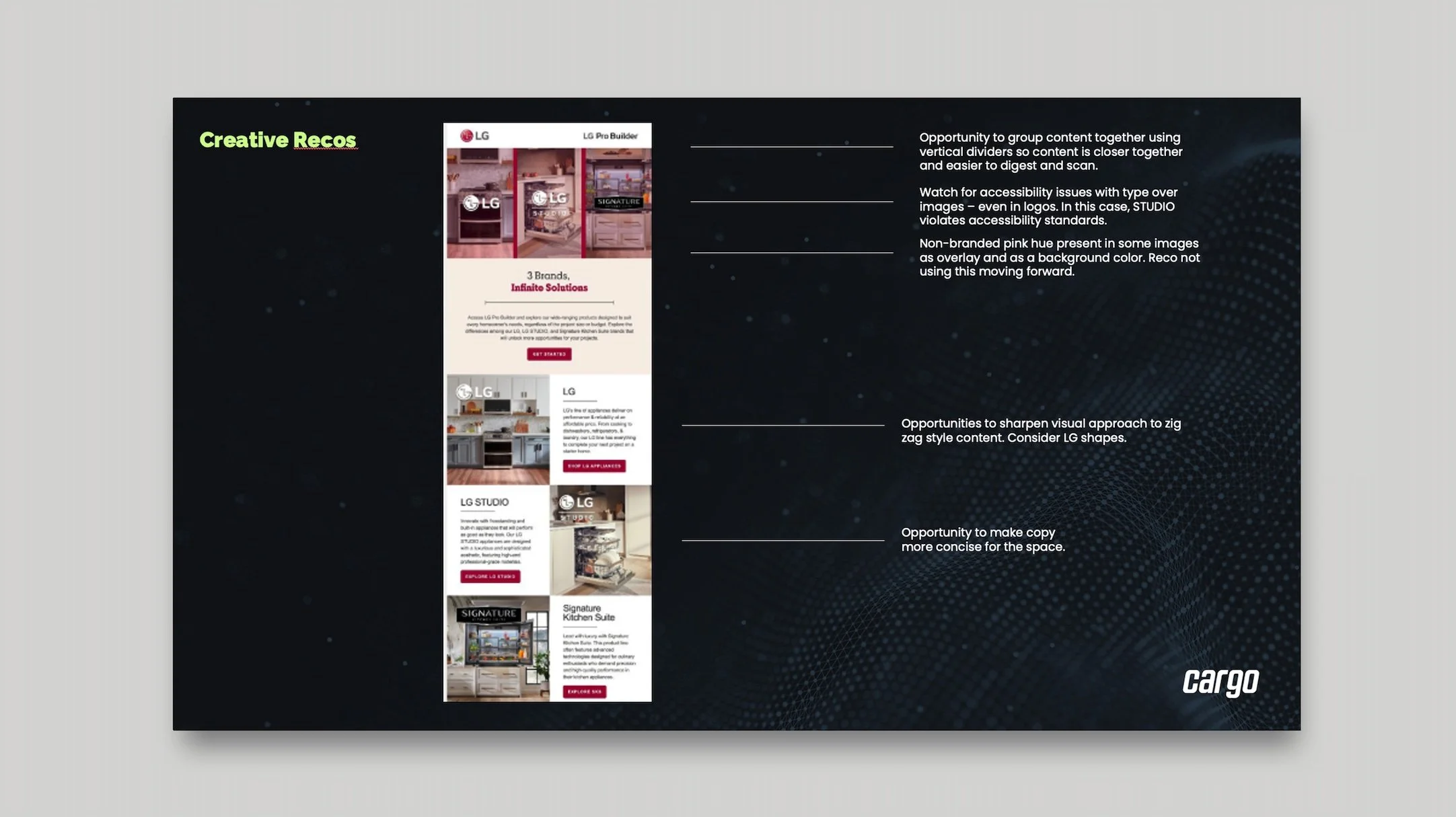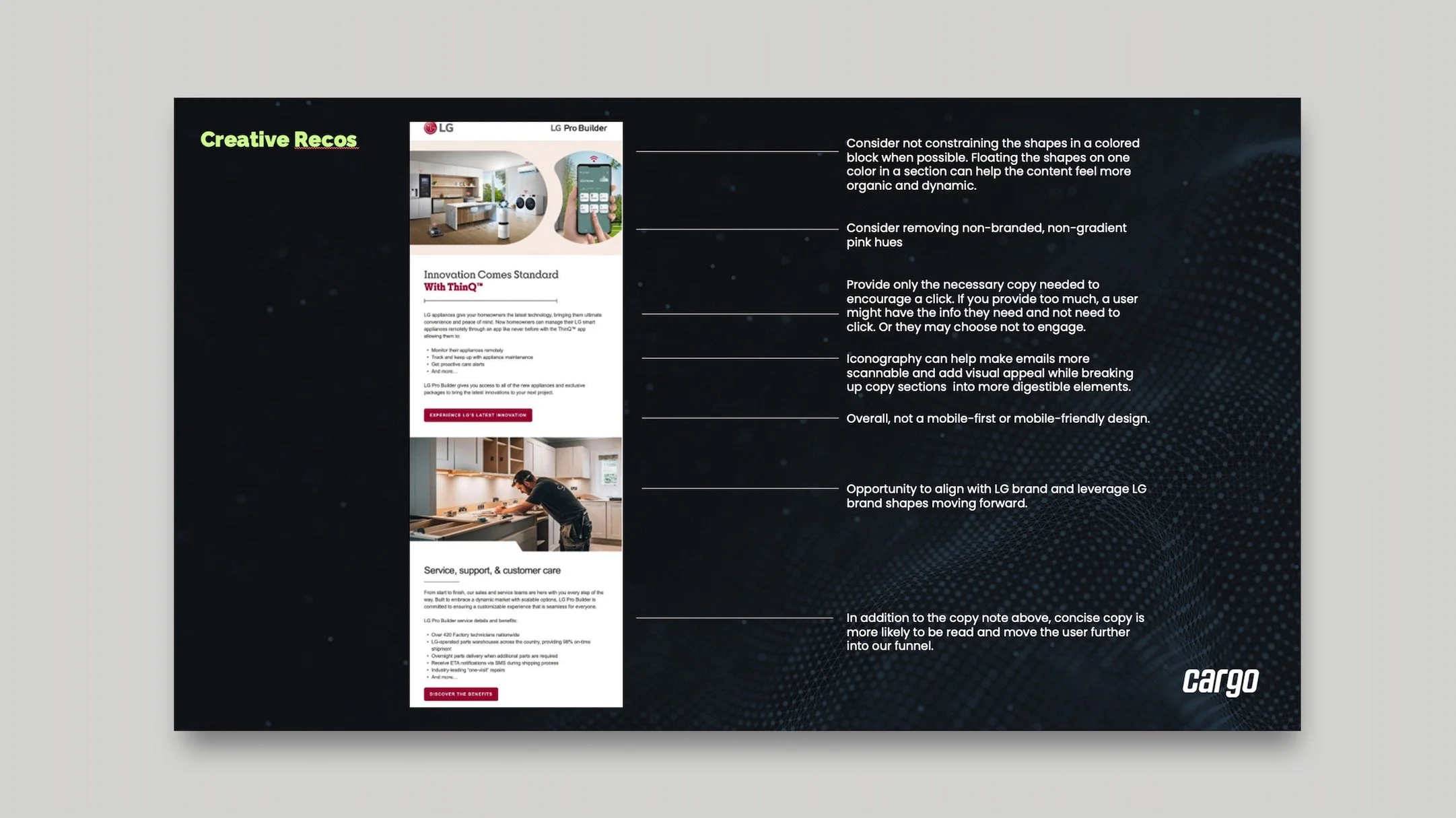 LG Pro Builder sells the LG portfolio of appliances to a variety of builder types. I partnered with our strategy and account teams to audit their email streams then refresh them creatively and strategically. In the past, their emails were too copy heavy, not mobile-friendly, did not follow modern email best practices, had opportunities for a better visual flow, and the look and feel did not align to the new LG brand. Take a look at few parts and pieces from the overall audit first.