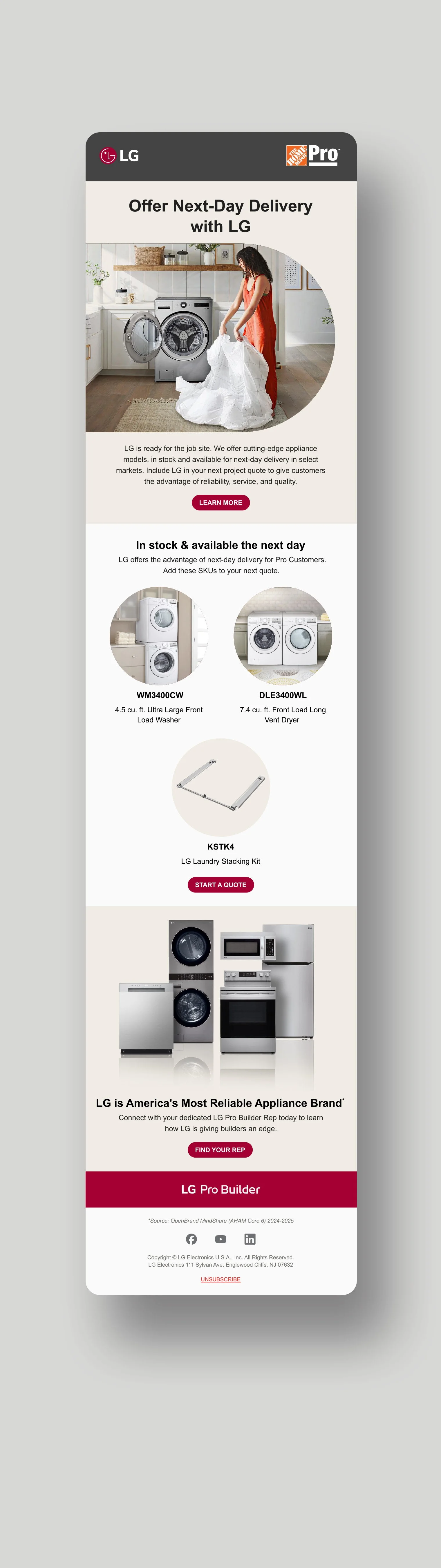 Below, you’ll see the result of the audit including a refresh of their initial “Welcome Stream” that was designed to educate users on all the benefits of LG Pro Builder and push them to connect with a rep. In addition to aligning to modern best practices, the emails were redesigned to follow the brand guide. I even pushed to use new AI generated imagery in a few spots at their image library did not feature any imagery that showed the target audience. You’ll also see a few other emails crafted for a Home Depot partnership, re-activations, and more.